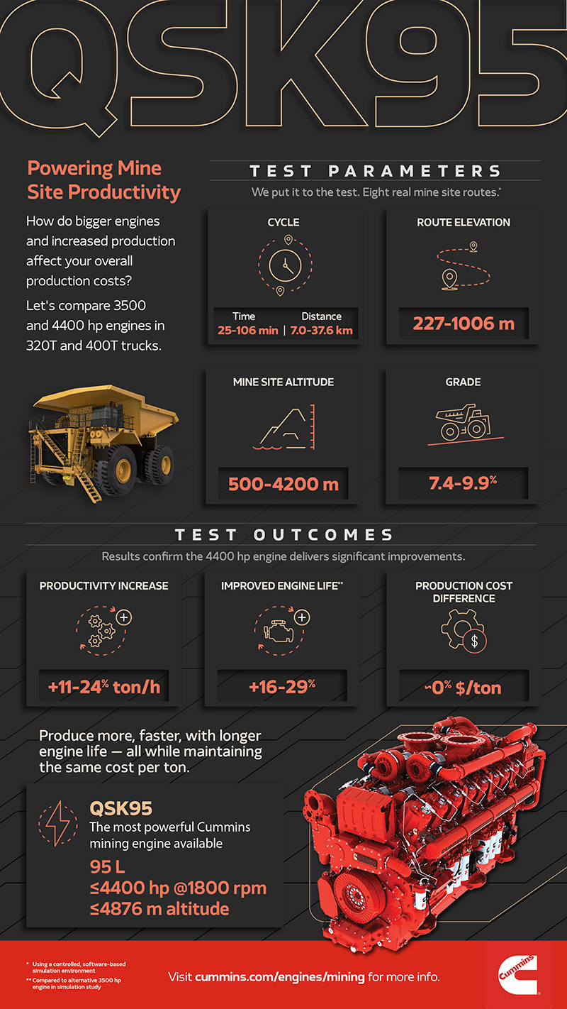 Результаты обширного имитационного исследования Cummins показали, что 400-тонный грузовик, приводимый в движение QSK95, был на 11 процентов более продуктивным, чем тот же грузовик с двигателем мощностью 3500 лошадиных сил.